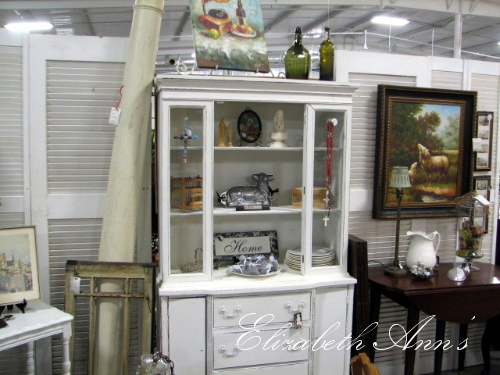 There are no walls in the area of the store I'm in so Mr. EA and I created a back wall by attaching shutters to a china cabinet with metal braces. I'm not selling the cabinet because it's in really bad shape but it works great for display and to anchor the shutters. I took the door off and plan to take the side glass panels out also. I can also store supplies I need in the lower half. This also created a wall for the person next to me.